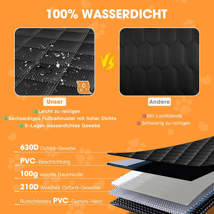 Antwort 2: Ja, die Decke besteht aus hochwertigem 630D Oxford-Gewebe mit einer PVC-Beschichtung, die sowohl Wasser als auch Kratzer abweist. Dadurch bleibt Ihr Rücksitz auch nach vielen Abenteuern in hervorragendem Zustand.